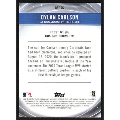 This is a 2021 Bowman Chrome Rookie of the Year Favorites Refractors Dylan Carlson baseball card. The card is #RRY-DC and pictures show condition. Team(s): St. Louis Cardinals Rookie Card (RC)