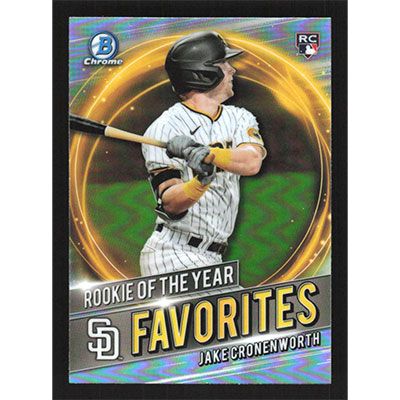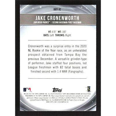 This is a 2021 Bowman Chrome Rookie of the Year Favorites Refractors Jake Cronenworth baseball card. The card is #RRY-JC and pictures show condition. Team(s): San Diego Padres Rookie Card (RC)