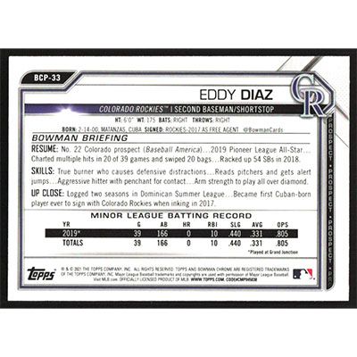 This is a 2021 Bowman Chrome Sapphire Prospects Eddy Diaz baseball card. The card is #BCP-33 and pictures show condition.