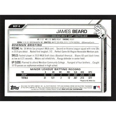 This is a 2021 Bowman Chrome Sapphire Prospects James Beard baseball card. The card is #BCP-6 and pictures show condition.