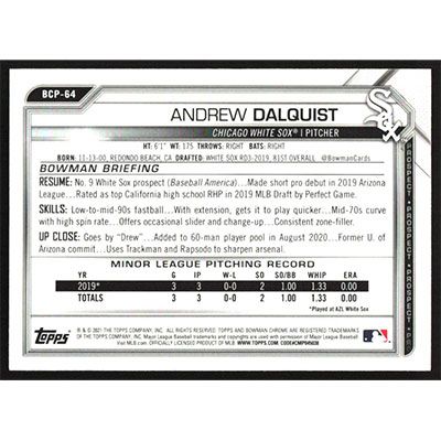 This is a 2021 Bowman Chrome Sapphire Prospects Andrew Dalquist baseball card. The card is #BCP-64 and pictures show condition. Team(s): Chicago White Sox