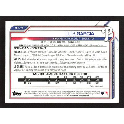 This is a 2021 Bowman Chrome Sapphire Prospects Luis Garcia baseball card. The card is #BCP-79 and pictures show condition. Team(s): Philadelphia Phillies
