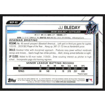 This is a 2021 Bowman Chrome Sapphire Prospects JJ Bleday baseball card. The card is #BCP-93 and pictures show condition.
