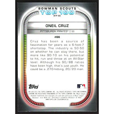 This is a 2021 Bowman Chrome Scouts Top 100 Refractors Oneil Cruz baseball card. The card is #BTP-66 and pictures show condition. Team(s): Pittsburgh Pirates
