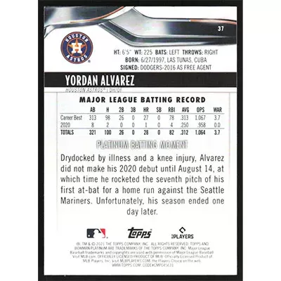 This is a 2021 Bowman Platinum Yordan Alvarez baseball card. The card is #37 and pictures show condition.