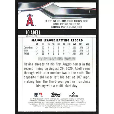 This is a 2021 Bowman Platinum Jo Adell baseball card. The card is #5 and pictures show condition.