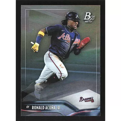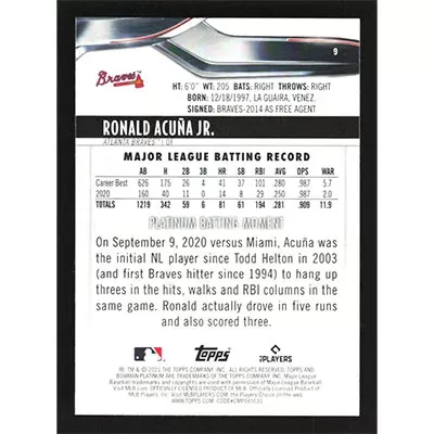 This is a 2021 Bowman Platinum Ronald Acuña Jr. baseball card. The card is #9 and pictures show condition.