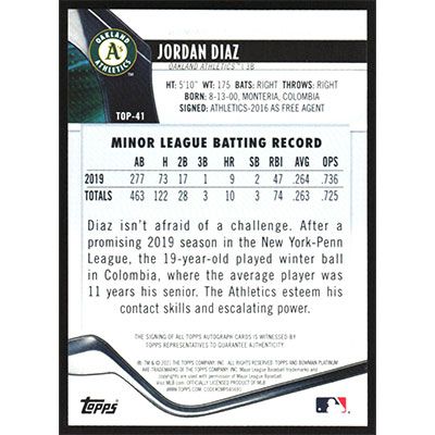 This is a 2021 Bowman Platinum Top Prospect Autographs Jordan Diaz autographed baseball card. This card has been signed, in blue, by Jordan Diaz, and is certified authentic by Topps. The card is #TOP-41 and pictures show condition.
