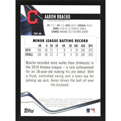 This is a 2021 Bowman Platinum Top Prospects Ice Aaron Bracho baseball card. The card is #TOP-66 and pictures show condition.