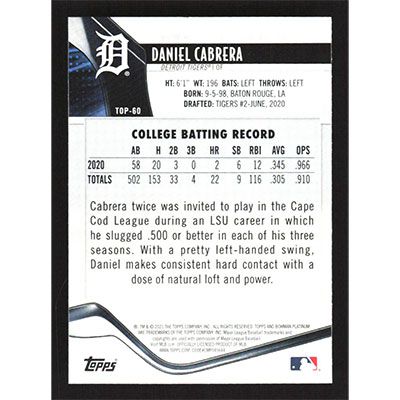 This is a 2021 Bowman Platinum Top Prospects Daniel Cabrera baseball card. The card is #TOP-60 and pictures show condition.