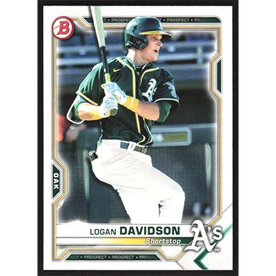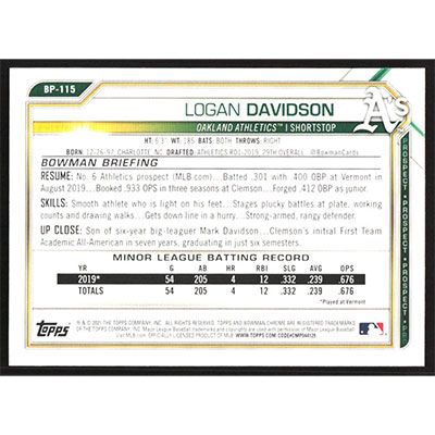 This is a 2021 Bowman Prospects Logan Davidson baseball card. The card is #BP-115 and pictures show condition.