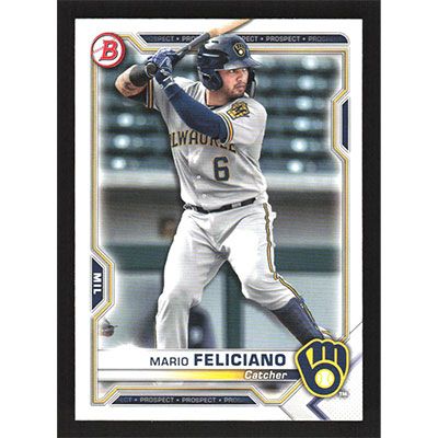 This is a 2021 Bowman Prospects Mario Feliciano baseball card. The card is #BP-133 and pictures show condition.
