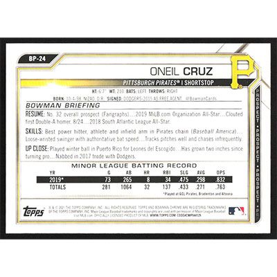 This is a 2021 Bowman Prospects Oneil Cruz baseball card. The card is #BP-24 and pictures show condition.