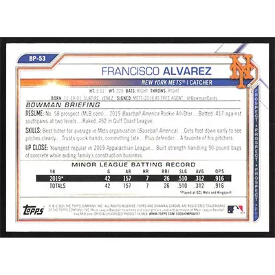 This is a 2021 Bowman Prospects Francisco Alvarez baseball card. The card is #BP-53 and pictures show condition.