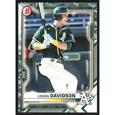 This is a 2021 Bowman Prospects Camo Logan Davidson baseball card. The card is #BP-115 and pictures show condition.