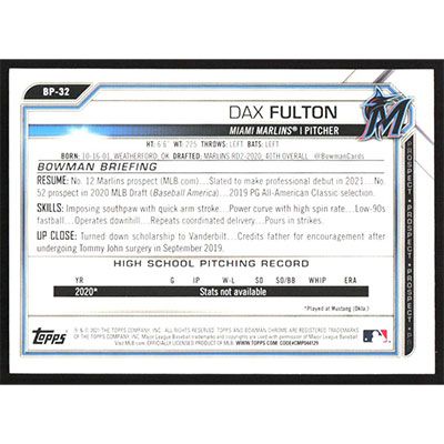 This is a 2021 Bowman Prospects Camo Dax Fulton baseball card. The card is #BP-32 and pictures show condition.