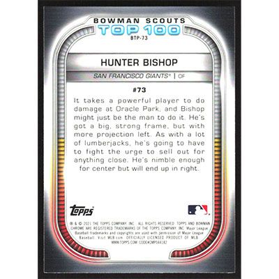This is a 2021 Bowman Scouts Top 100 Refractors Hunter Bishop baseball card. The card is #BTP-73 and pictures show condition. Team(s): San Francisco Giants