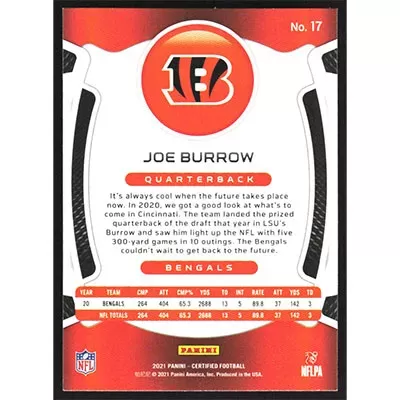 This is a 2021 Certified Joe Burrow football card. The card is #17 and pictures show condition.