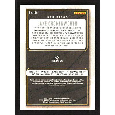 This is a 2021 Diamond Kings Jake Cronenworth short print baseball card. The card is #149 and pictures show condition. Team(s): San Diego Padres Rookie Card (RC)