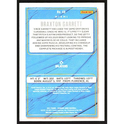 This is a 2021 Diamond Kings Braxton Garrett baseball card. The card is #48 and pictures show condition.