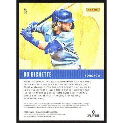 This is a 2021 Diamond Kings Elegance Bo Bichette baseball card. The card is #E-9 and pictures show condition.