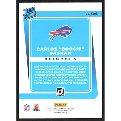 This is a 2021 Donruss Carlos "Boogie" Basham Rated Rookie football card. The card is #306 and pictures show condition. Team: Buffalo Bills Rookie Card