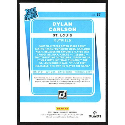 This is a 2021 Donruss Dylan Carlson Rated Rookie baseball card. The card is #37 and pictures show condition. Team(s): St. Louis Cardinals Rookie Card (RC)