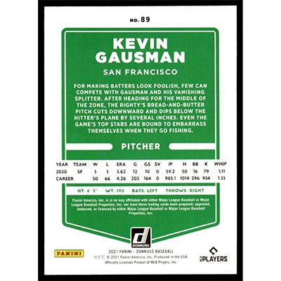 This is a 2021 Donruss Kevin Gausman baseball card. The card is #89 and pictures show condition.