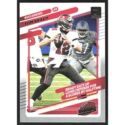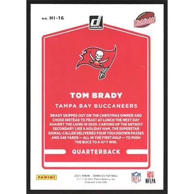 This is a 2021 Donruss Highlights Tom Brady football card. The card is #HI-16 and pictures show condition.