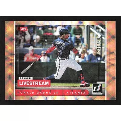This is a 2021 Donruss Livestream Ronald Acuña Jr. baseball card. The card is #LS5 and pictures show condition. This card is limited; #'d 241/999. Team(s): Atlanta Braves