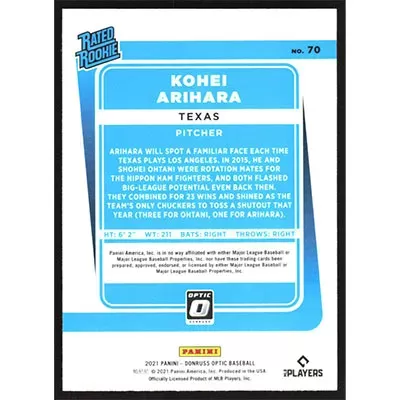 This is a 2021 Donruss Optic Kohei Arihara Rated Rookie baseball card. The card is #70 and pictures show condition. Team(s): Texas Rangers Rookie Card (RC)