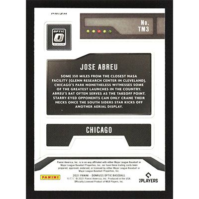 This is a 2021 Donruss Optic T-Minus 3...2...1 Holo Jose Abreu baseball card. The card is #TM3 and pictures show condition.