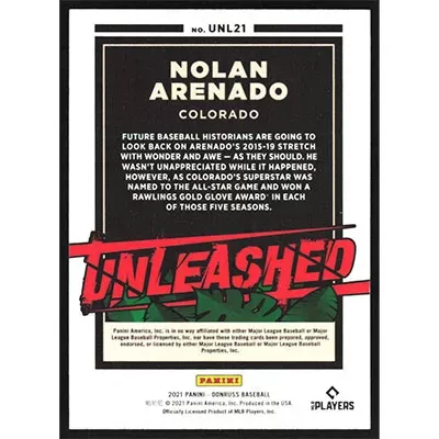 This is a 2021 Donruss Unleashed Diamond Nolan Arenado baseball card. The card is #UNL21 and pictures show condition.