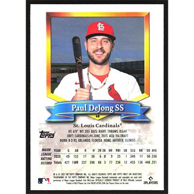 This is a 2021 Finest Flashbacks Paul DeJong baseball card. The card is #68 and pictures show condition.