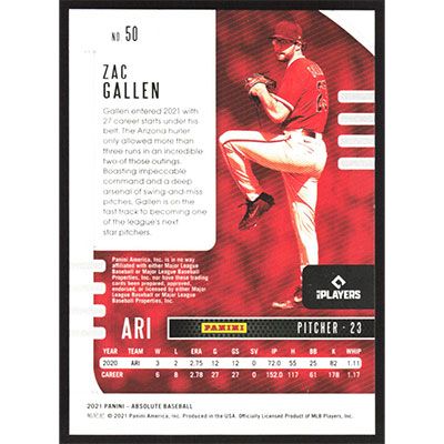 This is a 2021 Panini Absolute Spectrum Red Zac Gallen baseball card. The card is #50 and pictures show condition. This card is limited; #'d 14/99. Team(s): Arizona Diamondbacks