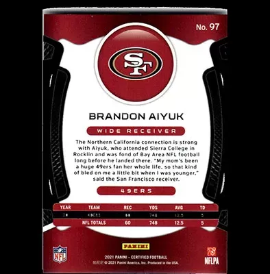 This is a 2021 Panini Certified Brandon Aiyuk football card. The card is #97 and is in NM-MT condition.