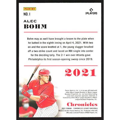 This is a 2021 Panini Chronicles Alec Bohm baseball card. The card is #1 and pictures show condition. Team(s): Philadelphia Phillies Rookie Card (RC)