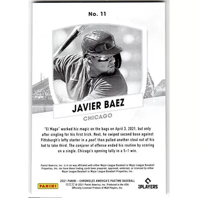 This is a 2021 Panini Chronicles America's Pastime Javier Baez baseball card. The card is #11 and pictures show condition.