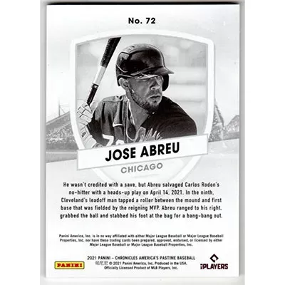 This is a 2021 Panini Chronicles America's Pastime Jose Abreu baseball card. The card is #72 and pictures show condition.