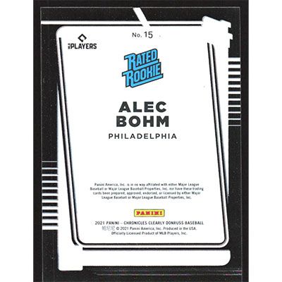 This is a 2021 Panini Chronicles Clearly Donruss Alec Bohm Rated Rookie baseball card. The card is #15 and pictures show condition. Team(s): Philadelphia Phillies Rookie Card (RC)