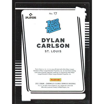 This is a 2021 Panini Chronicles Clearly Donruss Dylan Carlson Rated Rookie baseball card. The card is #17 and pictures show condition. Team(s): St. Louis Cardinals Rookie Card (RC)