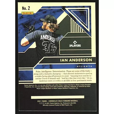 This is a 2021 Panini Chronicles Gold Standard Ian Anderson baseball card. The card is #2 and pictures show condition. Team(s): Atlanta Braves Rookie Card (RC)