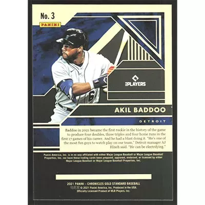This is a 2021 Panini Chronicles Gold Standard Red Akil Baddoo baseball card. The card is #3 and pictures show condition. This card is limited; #'d 033/199.