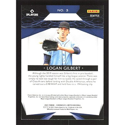 This is a 2021 Panini Chronicles Limited Logan Gilbert baseball card. The card is #3 and pictures show condition. Team(s): Seattle Mariners Rookie Card (RC)