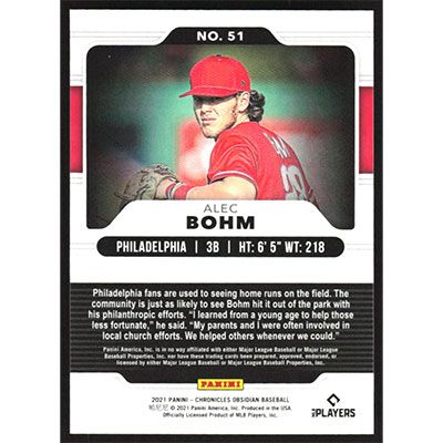 This is a 2021 Panini Chronicles Obsidian Alec Bohm baseball card. The card is #51 and pictures show condition. Team(s): Philadelphia Phillies Rookie Card (RC)