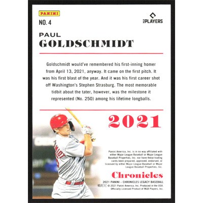 This is a 2021 Panini Chronicles Red Paul Goldschmidt baseball card. The card is #4 and pictures show condition. This card is limited; #'d 037/100. Team(s): St. Louis Cardinals