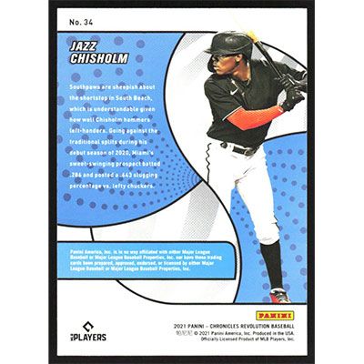 This is a 2021 Panini Chronicles Revolution Jazz Chisholm baseball card. The card is #34 and pictures show condition. Team(s): Miami Marlins Rookie Card (RC)
