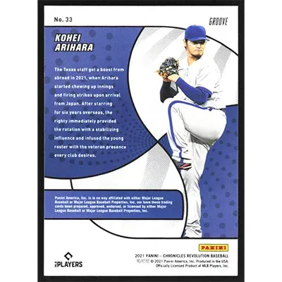 This is a 2021 Panini Chronicles Revolution Groove Kohei Arihara baseball card. The card is #33 and pictures show condition. Team(s): Texas Rangers Rookie Card (RC)