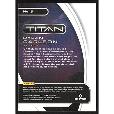 This is a 2021 Panini Chronicles Titan Dylan Carlson baseball card. The card is #5 and pictures show condition. Team(s): St. Louis Cardinals Rookie Card (RC)