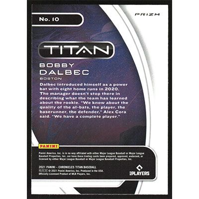 This is a 2021 Panini Chronicles Titan Blue Velocity Bobby Dalbec baseball card. The card is #10 and pictures show condition. Team(s): Boston Red Sox Rookie Card (RC)